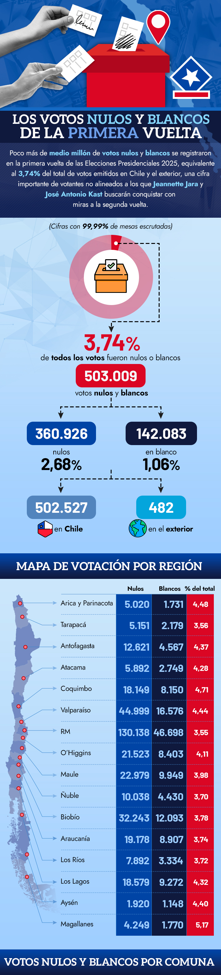 Los votos considerados no válidos fueron el 3,74% del total y la Región Metropolitana fue la que registró una menor proporción. No obstante se trata de alrededor de 500 mil sufragios de votantes no alineados que atraen la atención de Jeannette Jara y José Antonio Kast para el balotaje.