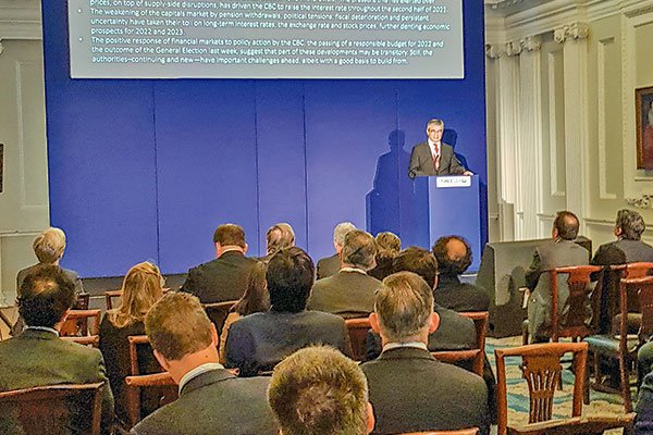 A pesar de la rápida recuperación de la economía, advirtió Marcel, «los activos financieros chilenos se han depreciado más que sus pares debido a factores idiosincráticos». En un gráfico, Marcel mostró como entre abril y noviembre, el peso chileno fue la segunda moneda más depreciada frente al dólar, superado solo por la lira turca; las tasas de los bonos a 10 años aumentaron más de 200 puntos base, superados solo por los de Brasil, y el riesgo país, medido por los credit default swaps subió 30 puntos base, superado solo por Colombia.