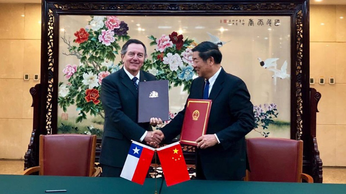 El canciller Roberto Ampuero junto al presidente de la Comisión Nacional de Desarrollo y Reforma, He Lifeng, firmaron el acuerdo de cooperación entre Chile y China de la iniciativa de la Franja y la Ruta, en el marco de la realización del Chile Week en el país asiático.