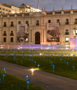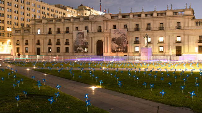 Esta mañana el Palacio de La Moneda amaneció con más de 4.000 remolinos azules en su explanada, que fueron instalados por más de 100 organizaciones para concientizar contra el maltrato infantil en el país.