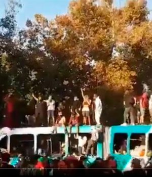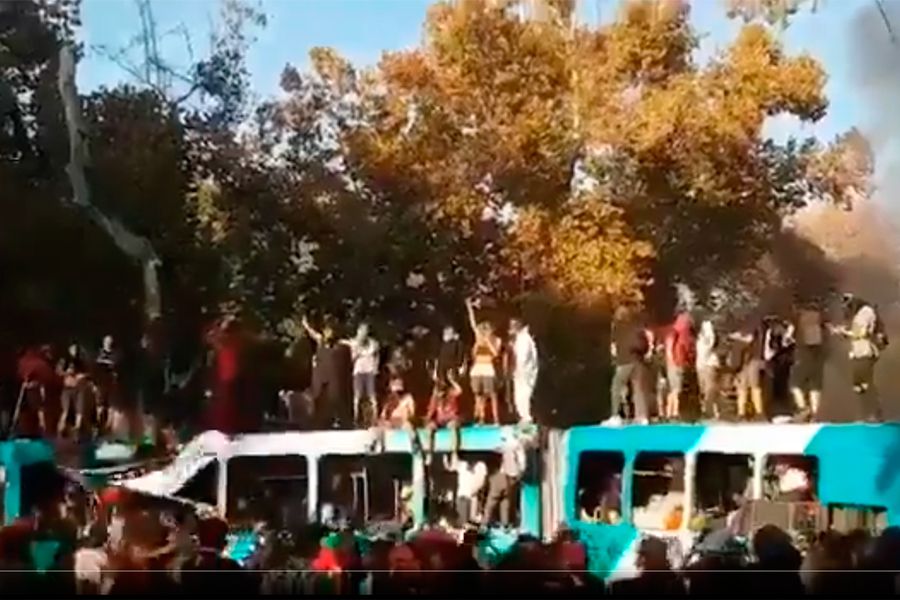 En el centro de Santiago, un grupo de manifestantes se trasladó desde la Plaza Italia hasta el Parque Forestal. Ahí, los manifestantes se tomaron un bus oruga del Transantiago y, tras subirse al techo del vehículo, comenzaron a gritar consignas contra el gobierno, mientras en las cercanías prendían fuego a barricadas.