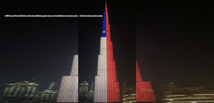 La torre Burj Khalifa, ubicada en Dubai y que es el rascacielo más alto del mundo con 828 metros de altura, se vistió de bandera chilena durante la noche del 18 de septiembre.