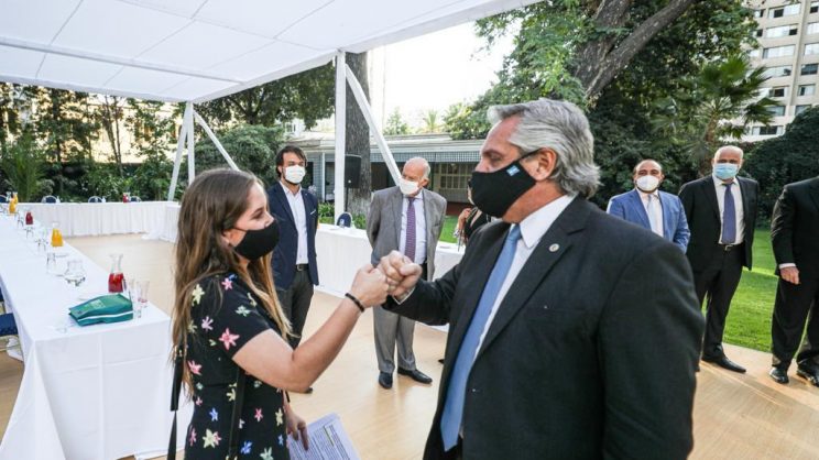 - En la reunión, según asistentes, MEO realizó ante Fernández una presentación de cada uno de los invitados. La escena ocurrió en el jardín de la embajada para respetar la distancia social, a partir del Covid-19.