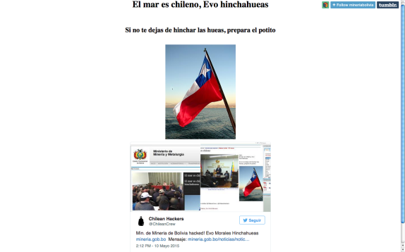 En horas de la tarde de este domingo, el grupo “Chilean Hackers” vulneró el sitio web del ministerio de Minería de Bolivia.