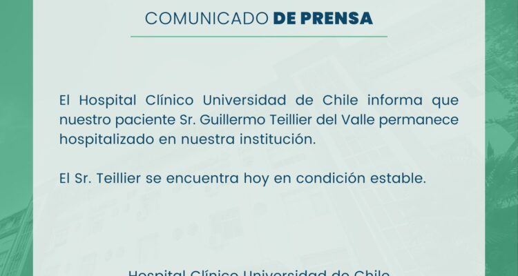 En un escueto comunicado, el recinto de salud informó que “nuestro paciente Sr. Guillermo Teillier del Valle permanece hospitalizado en nuestra institución”.