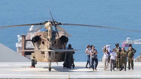 Tras el aterrizaje de los primeros helicópteros, el Ejército Israelí anunció la partida de más aeronaves desde la base de Reim. Un comunicado castrense detalló que los liberados Alon Ohel, Guy Gilboa Dalal y Omri Miran despegaron en helicópteros de la Fuerza Aérea, siendo acompañados por sus familias en el vuelo de regreso.