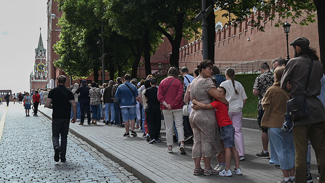 Cientos de personas hacían cola en una de las cuestas empedradas que conduce a la Plaza Roja, ya que el mausoleo sólo abre tres horas, de martes a jueves. Estas hileras de gente no se veían desde tiempos soviéticos, cuando el edificio de mármol que acoge el cuerpo embalsamado de Lenin era de obligada visita para menores y mayores.