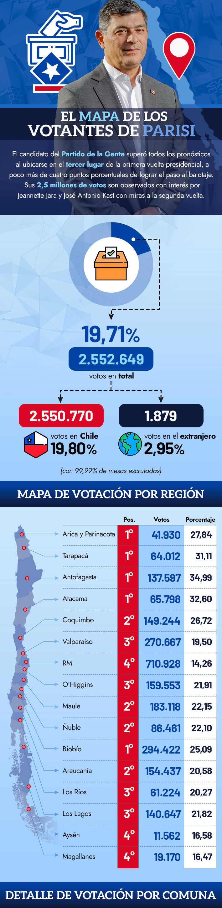 El abanderado del Partido de la Gente, Franco Parisi, logró imponerse a sus siete competidores en cinco regiones del país y estuvo entre los dos más votados en 207 comunas del país disputando el segundo lugar a José Antonio Kast. El siguiente es el mapa regional y comunal de los votantes de Parisi, transformados en segunda vuelta en el sufragante bisagra para efectos del balotaje del 14 de diciembre proximo.