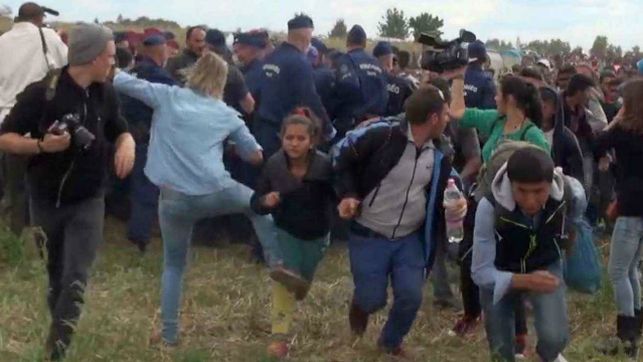 Las imágenes de esta camarógrafa de televisión, con su herramienta al hombro, dando puntapiés a un hombre y su hijo e intentando zancadillear a una niña pequeña en la frontera entre Hungría ySerbia, suscitaron gran indignación.
