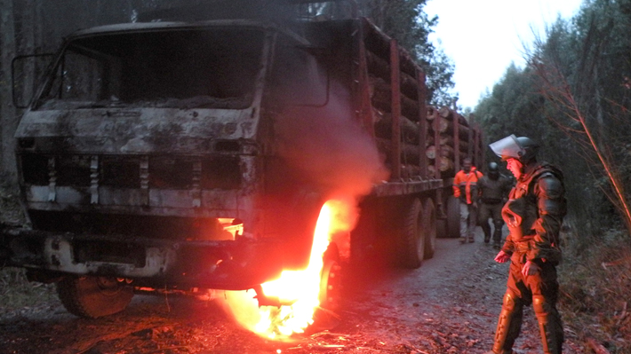El miércoles fue en Chol Chol; hoy, en Collipulli. Se trata de un nuevo ataque incendiario a maquinaria en menos de una semana en la Región de La Araucanía. Según confirmó Emol, el hecho ocurrió en el fundo Santa Rosa Mininco y afectó a cinco camiones. Allí se encontraron lienzos alusivos a Camilo Catrillanca.