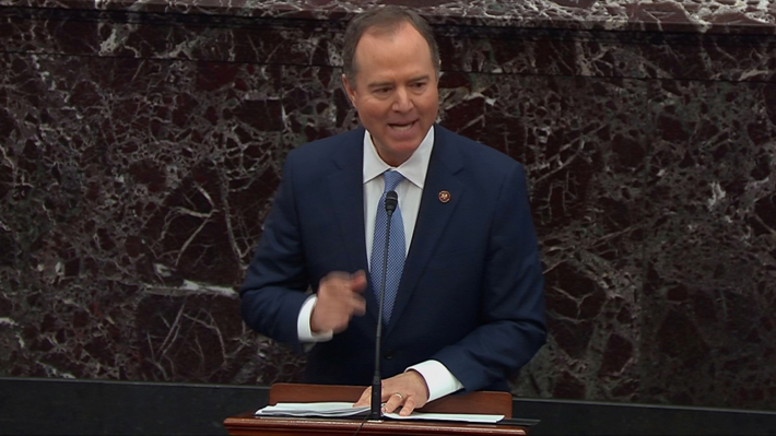 Además, el líder republicano aseguró que el Senado no terminará su jornada hasta que se aprueben las reglas del caso, ya que los demócratas planean presentar varias enmiendas, con el fin de asegurar un juicio «justo», como lo llamó el cabecilla del grupo de fiscales de la Cámara de Representantes, el congresista demócrata Adam Schiff, en su discurso inicial del «impeachment» (en la foto).