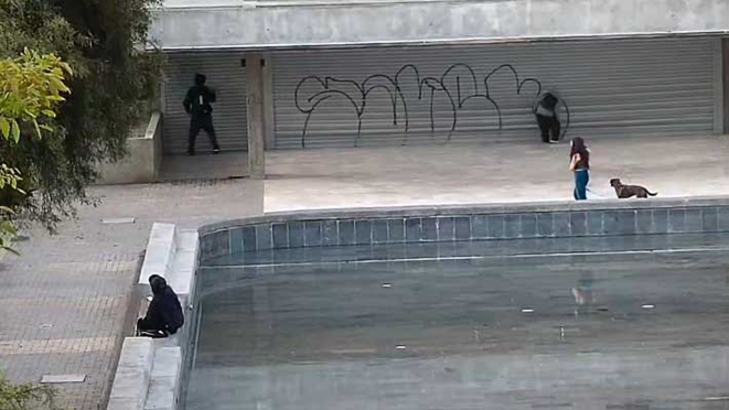 Previamente, los mismo sujetos también rayaron la pileta cercana al recinto, realizando una serie de rayados en la estructura.