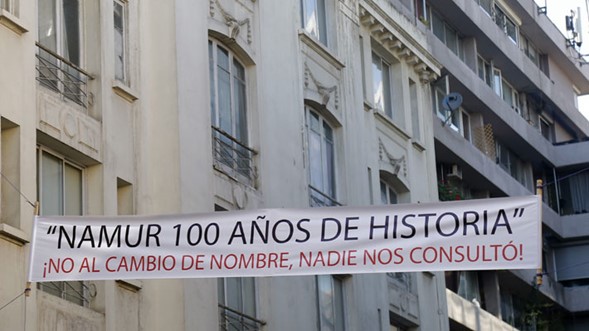 El pasado jueves vecinos de la calle Namur, en la comuna de Santiago, desplegaron un letrero con un mensaje: «Namur 100 años de historia. ¡No al cambio de nombre, nadie nos consultó!».