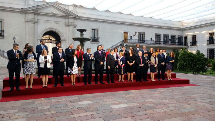 En ese momento, Bachelet además agradeció a su equipo de subsecretarios, quienes le devolvieron el saludo dándole las gracias a ella. Con un semblante tranquilo y manteniendo una sonrisa permanente, la Mandataria llegó a las 8:20 horas al Palacio de La Moneda, donde saludó a cientos de seguidores apostados en la Plaza de la Constitución, que enarbolaban banderas de los partidos de la Nueva Mayoría, incluida la DC. Antes de tomarse la fotografía oficial, la Presidenta conversó animadamente con el subsecretario de Relaciones Exteriores, Edgardo Riveros, uno de los más cercanos con ella del grupo. Mientras el subsecretatrio de Servicios Sociales, Juan Eduardo Faúndez, tuvo que subir a la tarima apoyado de una muleta debido a un corte de ligamientos jugando fútbol.