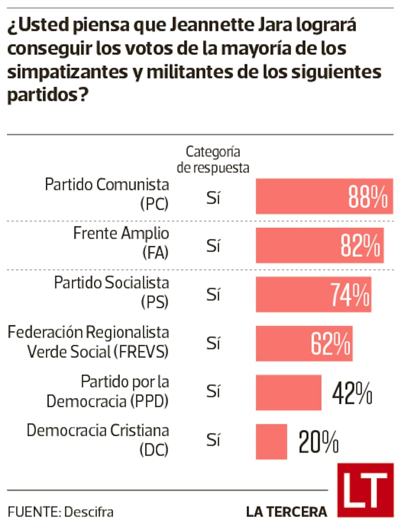De acuerdo al estudio, el 88% considera que la candidata logrará conseguir el apoyo de los electores cercanos al Partido Comunista (PC), la colectividad en que milita hasta ahora. Cerca están el Frente Amplio (FA), con el 82%; el Partido Socialista (PS); con el 74% y la Federación Regionalista Verde Social, con el 62%.