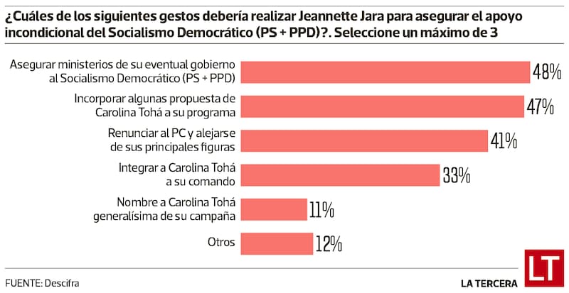 Por otra parte, a los encuestados se les preguntó qué gestos debería hacer Jara para “asegurar el apoyo incondicional del Socialismo Democrático”. Un 48% reconoció que considera necesario “asegurar ministerios de su eventual gobierno” a esa coalición, que agrupa al PS y el PPD. Un 47% es de la idea de “incorporar algunas propuesta de Tohá a su programa”. Y un 41% cree que sería un gesto valioso “renunciar al PC y alejarse de sus principales figuras”.