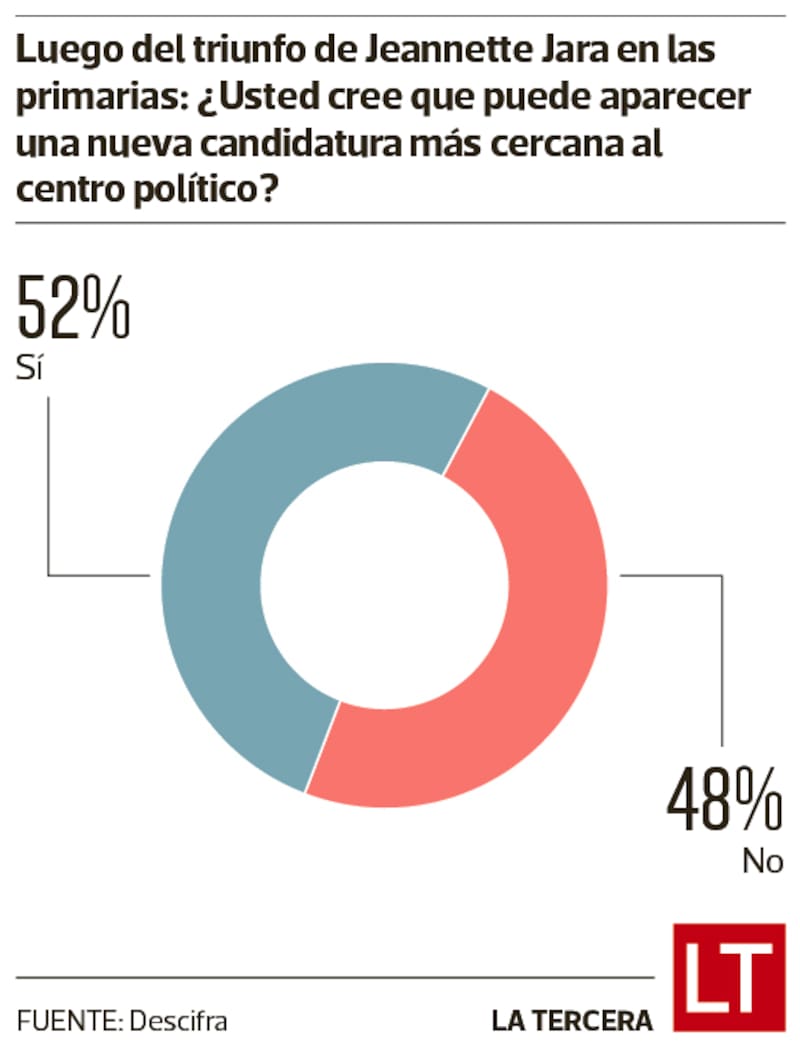 Otro dato relevante que arrojó la encuesta es que el 52% de los ciudadanos consultados piensa que “luego del triunfo de Jara en las primarias, puede aparecer una nueva candidatura más cercana al centro político”.