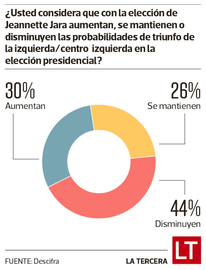 Por el contrario, quienes piensan que éstas aumentan son un 30%, mientras que aquellos que creen que las probabilidades de éxito con Jara como candidata se mantienen son un 26%.