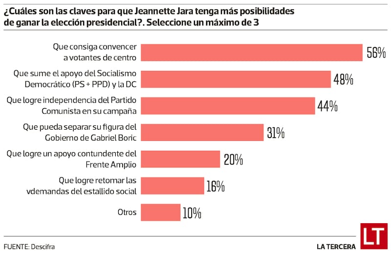 Descifra también consultó “¿cuáles son las claves para que Jara tenga más posibilidades de ganar la elección presidencial?“. Una mayoría (56%) respondió ”que consiga convencer a votantes de centro“. Un 48% contestó “que sume el apoyo del Socialismo Democrático y la DC” y un 44%, “que logre independencia del PC en su campaña”.
