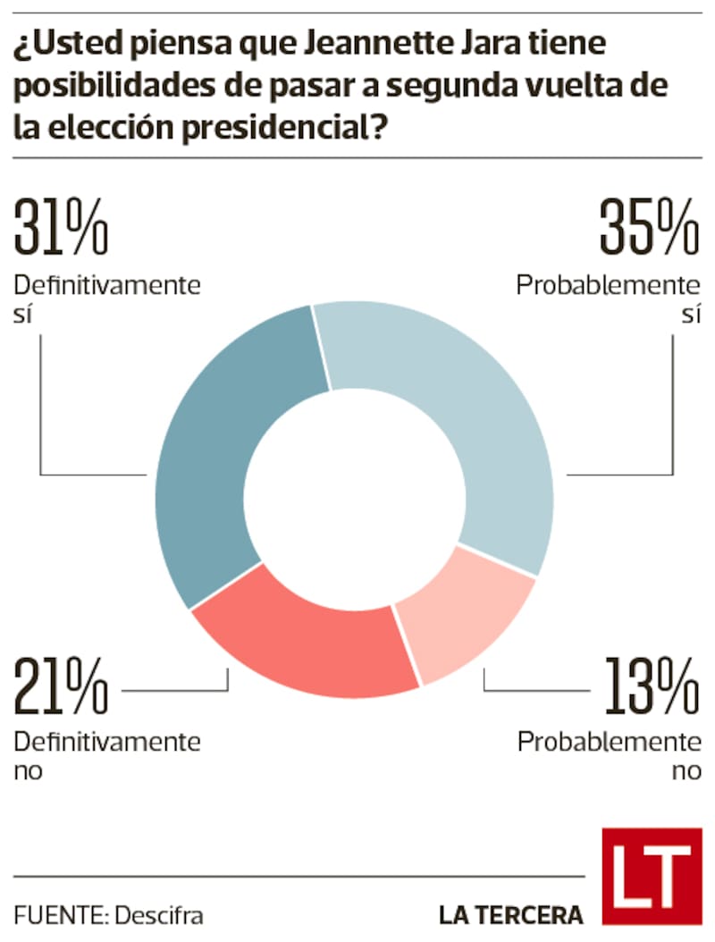 Al consultar si Jara “tiene posibilidades de pasar a segunda vuelta de la elección presidencial”, un 35% indica que “probablemente sí”, mientras que un 31% responde que “definitivamente sí pasaría”. Es decir, un 66% ve factible que la exministra del Trabajo pase a segunda vuelta.
