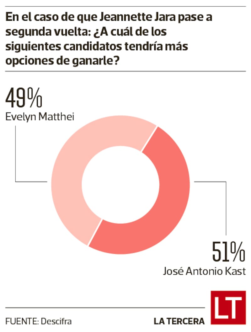 De cara a la segunda vuelta, de acuerdo a los encuestados, Jara tendría más opciones de ganarle a José Antonio Kast (51%) que a Evelyn Matthei (49%).