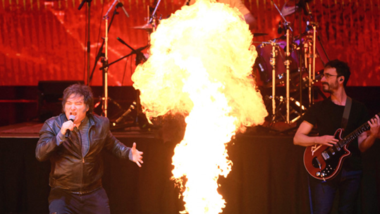 Milei cantó y bailó interpretando temas de rock nacional, incluyendo «Demoliendo Hoteles» de Charly García, canciones de Ratones Paranoicos, Gilda y Sandro. Durante el show agradeció a su círculo cercano, mencionando el «triángulo de hierro» formado por Karina Milei y Santiago Caputo, y respaldó públicamente a Diego Santilli como candidato en Buenos Aires.