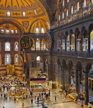 Convertida en mezquita tras la toma de Constantinopla por los otomanos en 1453, fue transformada en museo en 1934 por el dirigente de la joven República Turca, Mustafa Kemal Atatürk, que deseaba «ofrecerla a la humanidad».