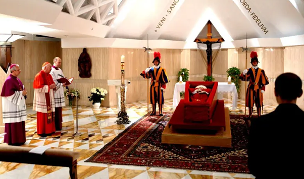 Después, en el Altar de la Confesión, bajo el baldaquino, el cardenal camarlengo presidirá la Liturgia de la Palabra, al final de la cual comenzará la visita de los fieles.