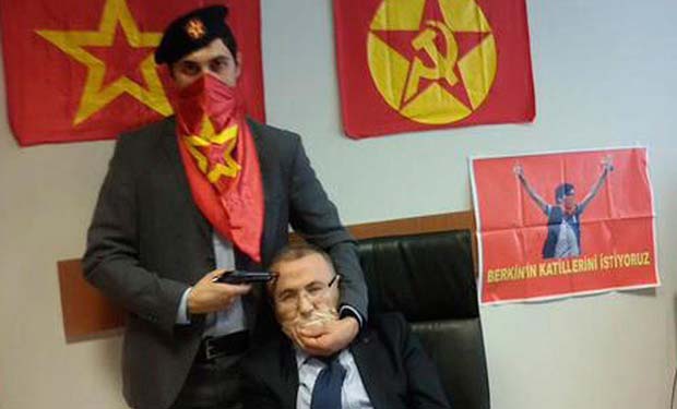 En las redes sociales se ha divulgado una foto que muestra a alguien poniendo la punta de una pistola en la cabeza del fiscal delante de una bandera de un partido prohibido, el DHKP-C.