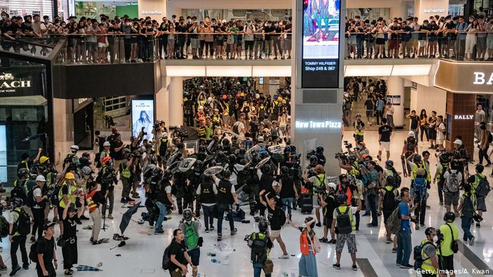 La tarde del domingo, decenas de miles de personas, 100.000 según los organizadores, marcharon por la ciudad. Todo fue pacífico hasta que entrada la noche se produjeron enfrentamientos que derivaron en caóticas escenas en un centro comercial, donde los manifestantes lanzaron botellas plásticas y paraguas a las fuerzas de seguridad, que respondieron con gas pimienta y golpeando con bastones y escudos.