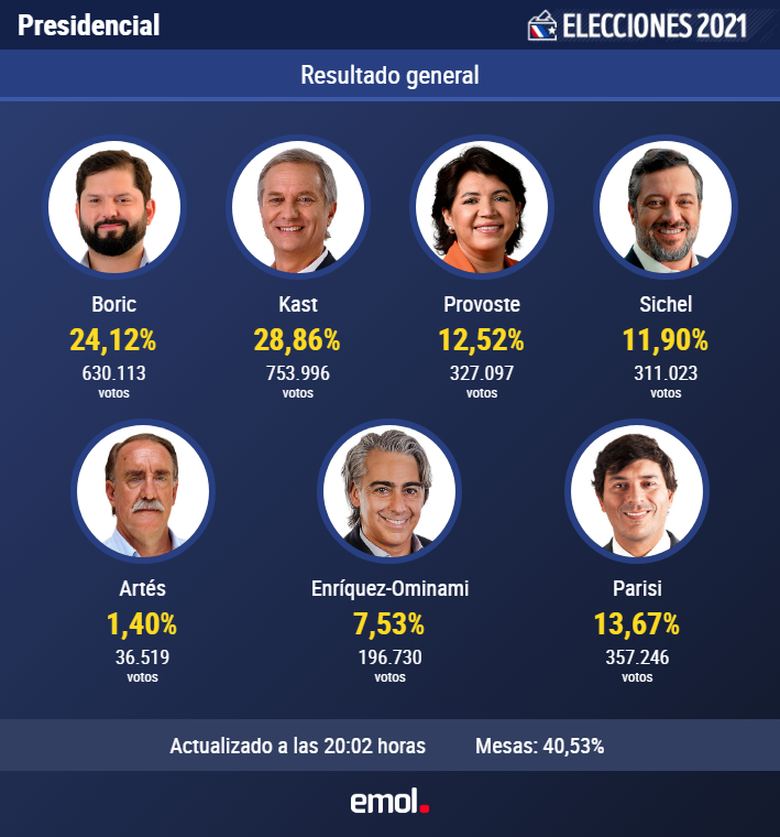 Ya a las 20 horas y con locales de votación aún en proceso eleccionario, Kast obtenía el primer lugar con el 40% de mesas escrutadas, seguido por Boric. En tercer lugar, en tanto, con quedó el fundador del Partido de la Gente, sin pisar el país, Franco Parisi. En el camino quedó también la carta de Nuevo Pacto Social, la senadora Yasna Provoste, seguida por Sebastián Sichel del pacto Chile Podemos Más, quien hace algunos minutos reconoció su derrota y dio un paso al costado de la vida política. El sexto lugar fue para Marco Enríquez-Ominami (PRO), y en último lugar figura Eduardo Artés (UPA).