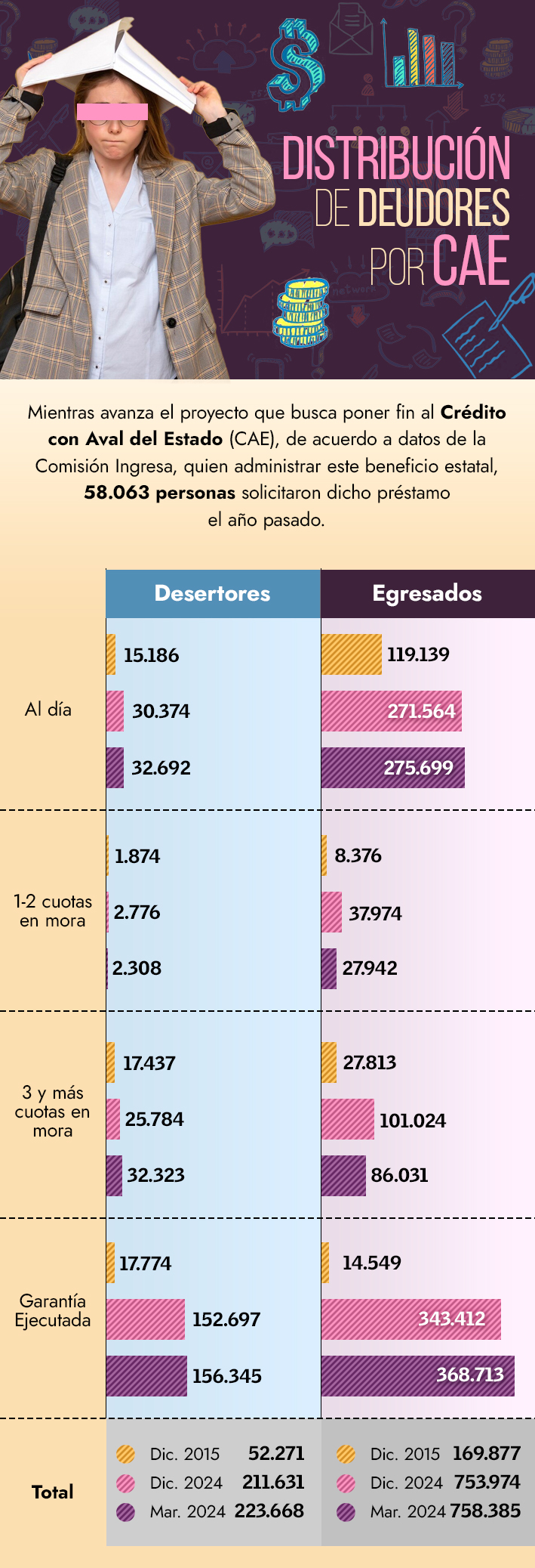 Cómo se distribuyen los deudores del CAE. De acuerdo a datos de la Comisión Ingresa, un 36% de los pagos del CAE están al día y unas 330 mil personas son deudoras del Fondo Solidario.