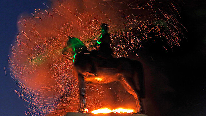 A eso de las 20:30 horas, cuando los manifestantes en el sector sobrepasaban el medio millar, sujetos prendieron fuego a la estatua del general Baquedano.